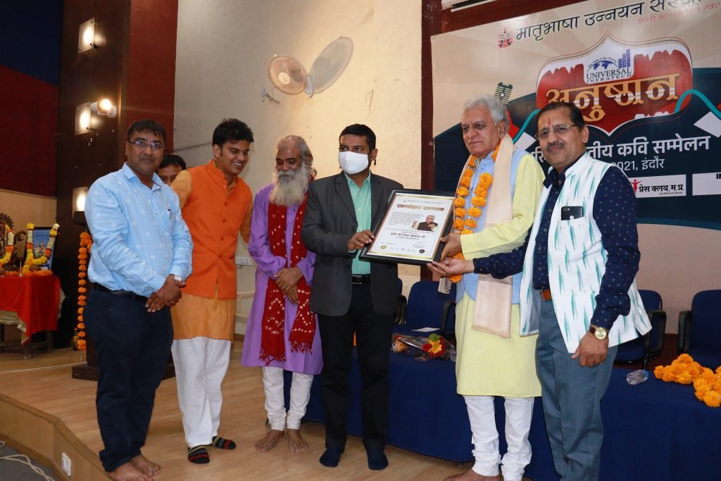 इंदौर। मातृभाषा उन्नयन संस्थान द्वारा आयोजित व यूनिवर्सल इंफ्राटेक द्वारा प्रायोजित अखिल भारतीय कवि सम्मेलन ‘अनुष्ठान’ स्थानीय प्रीतमलाल दुआ सभागृह में आयोजित हुआ, जिसमें बतौर विशिष्ट अतिथि पुलिस महानिरीक्षक हरिनारायण चारी मिश्र (आईपीएस), साहित्य अकादमी, म.प्र. शासन के निदेशक डॉ. विकास जी दवे, अन्तर्राष्ट्रीय चित्रकार एवं कवि बाबा सत्यनारायण मौर्य, प्रधान संपादक प्रजातंत्र के हेमंत शर्मा मधुर जायसवाल, धनराज माहेश्वरी उपस्थित रहे। अतिथियों द्वारा दीप प्रज्वलन के साथ काव्य अनुष्ठान का आरंभ हुआ। इसके बाद कवि हेमंत श्रीमाल को ‘स्वर्णाक्षर सम्मान’ से सम्मानित किया गया।