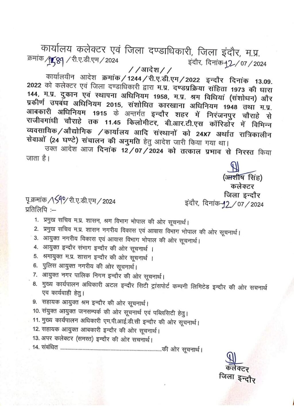 निरंजनपुर चौराहे से राजीव गांधी चौराहे तक के क्षेत्र में 24 घण्टे विभिन्न संस्थाओं और व्यसायिक संस्थाओं को खुले रखने का आदेश तत्काल प्रभाव से निरस्त कर दिया है।